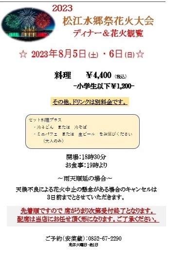 水郷祭の日のディナー予約を受け付け致します。