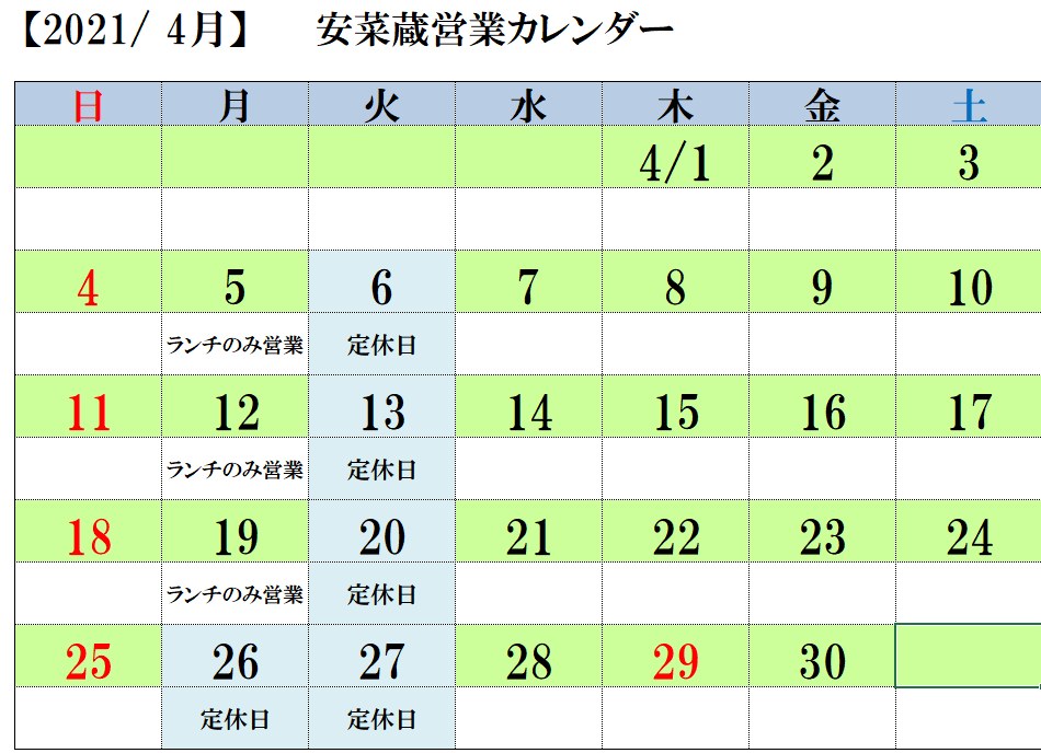 4/26 月曜日は店休日と致しますので